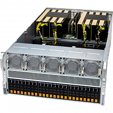 Двухпроцессорный сервер с графическим процессором высотой 4U на базе процессоров Intel Xeon Scalable 4-го поколения, который поддерживает восемь двухслотовых графических процессоров, решение для коммутатора PCIe 5.0, решение для жидкостного охлаждения, 32 модуля DIMM, 13 модулей PCIe 5.0, восемь модулей NVMe, четыре блока питания Titanium мощностью 3000 Вт, OCP 3.0, и ASUS ASMB11-iKVM